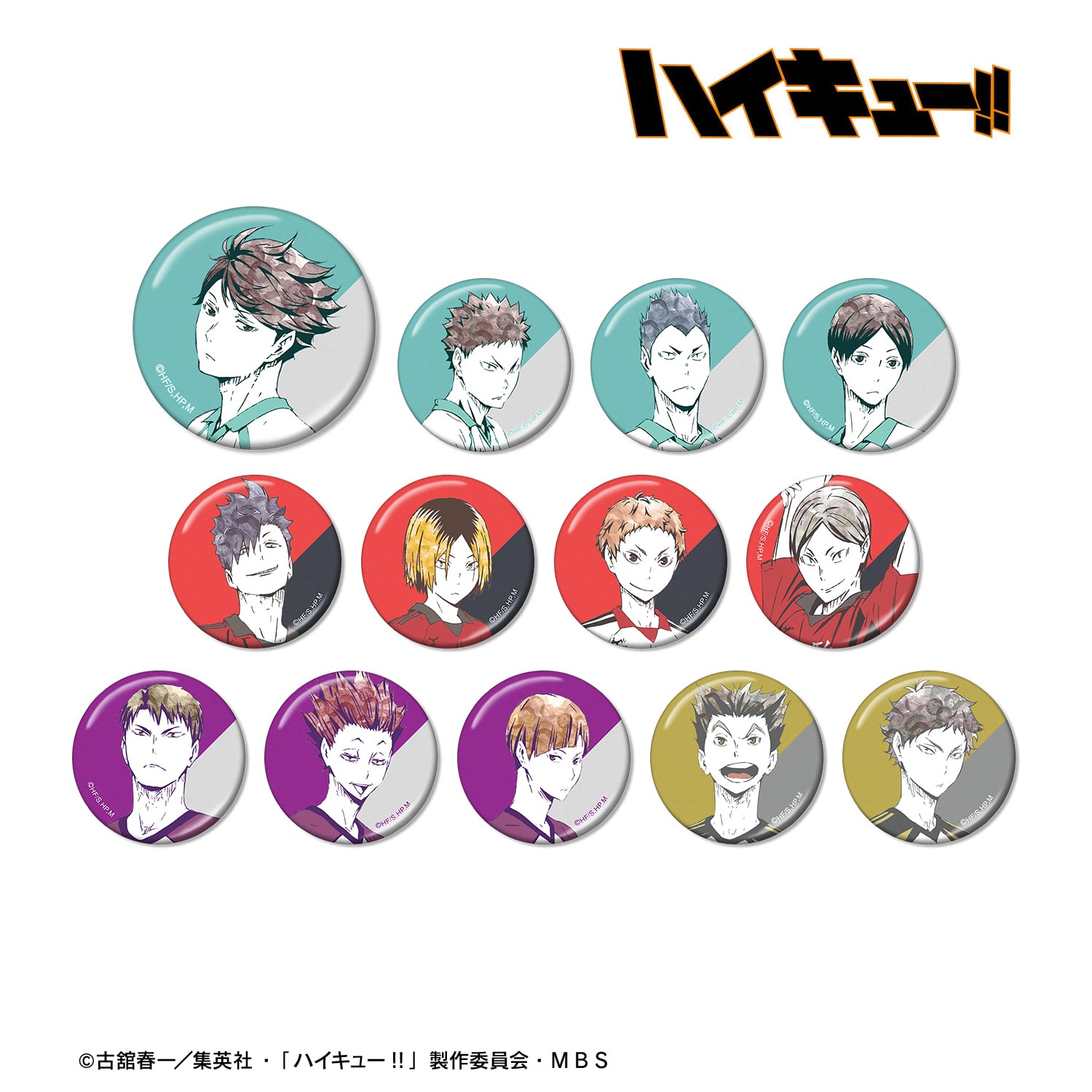 及川徹、岩泉一、金田一勇太郎、国見英、黒尾鉄朗、孤爪研磨、夜久衛輔、灰羽リエーフ、牛島若利、天童覚、白布賢二郎、木兎光太郎、赤葦京治のビジュアルを新たなタッチで魅力的に表現し、メタリック仕様の缶バッジに仕上げました。